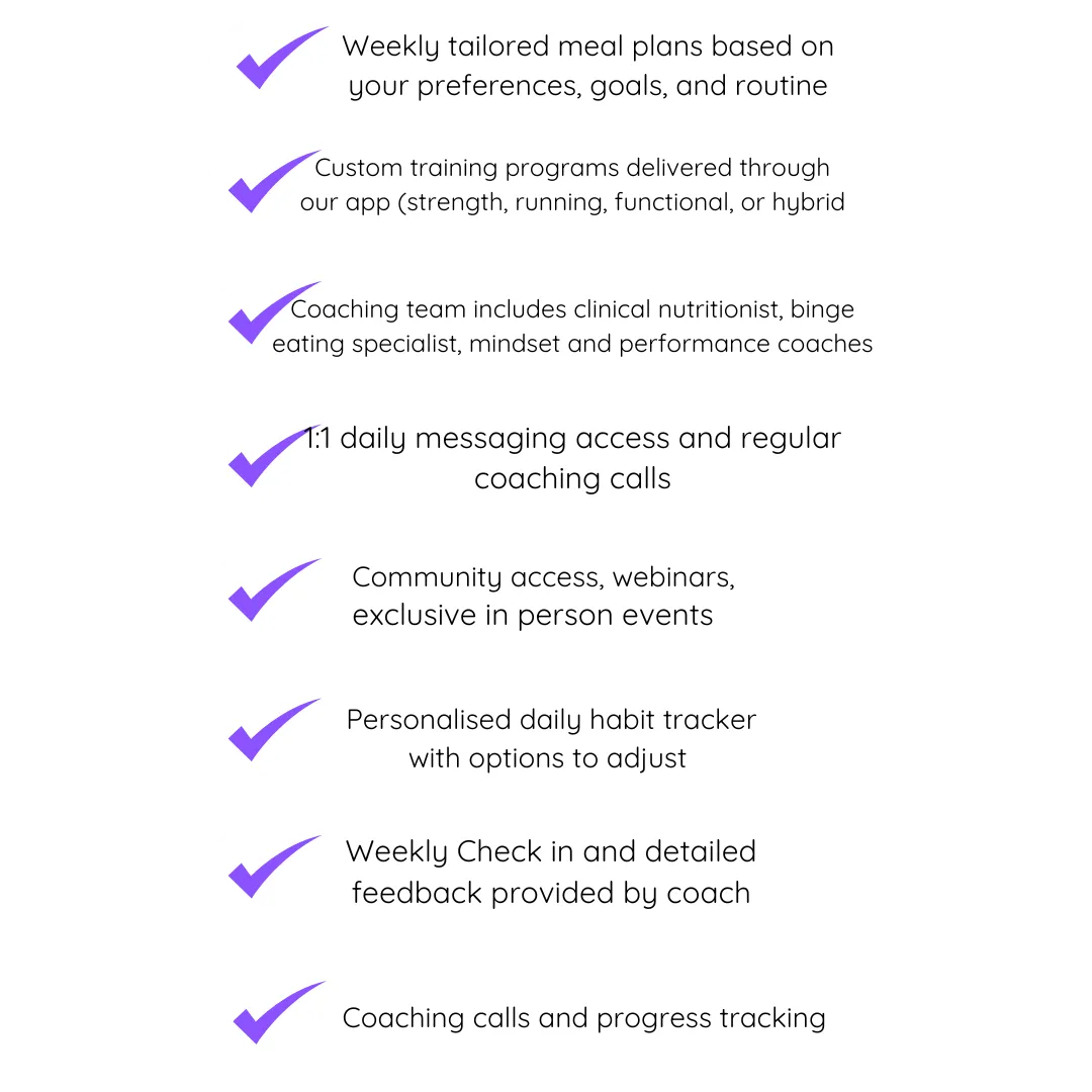 With tailored meals and a detailed plan, our 1:1 clients achieveresults whilst also building a sustainable and healthy lifestyle.